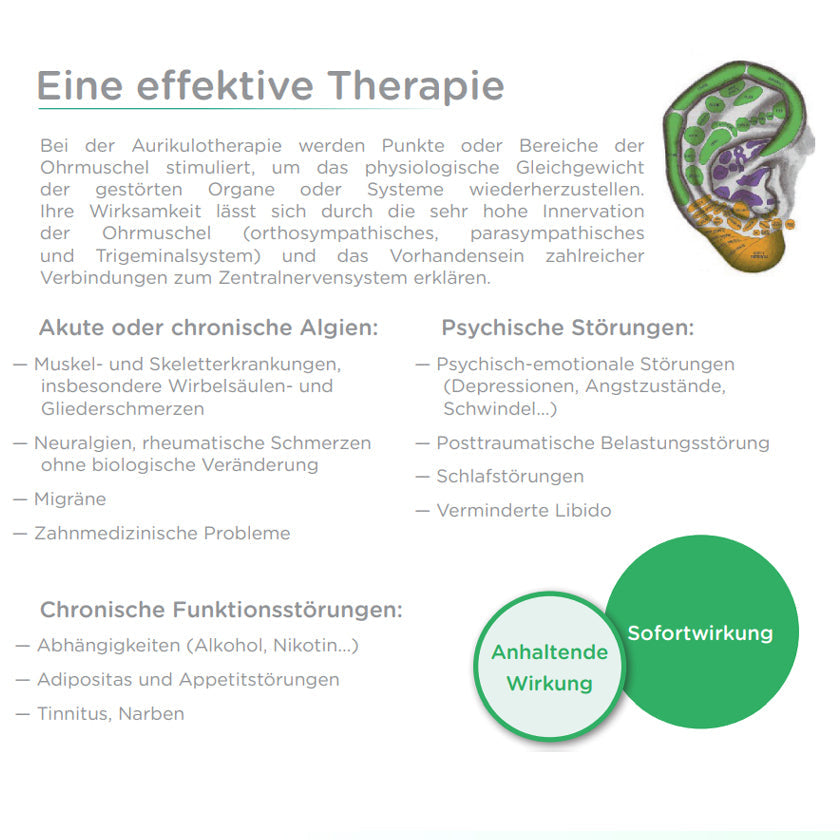 Zum Schutz kann die Nadel nach dem Einsetzen mit einem Klebeplättchen abgedeckt werden, wodurch die Wirkung erhalten bleibt, solange die Nadel im Ohr verbleibt. Ein Magnet in der Einführhilfe erzeugt ein Magnetfeld in der implantierten Nadel, das die Stimulation unterstützt.